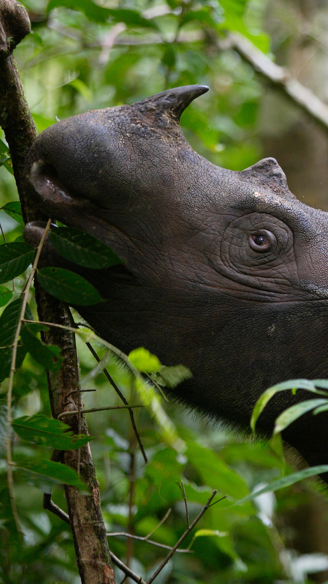 随着自然栖息地的减少和消失,成千上万的物种面临着灭绝的危险,图中的苏门答腊犀牛亦是如此。伐木业和狩猎业使得它们生存受到威胁,被列为国际自然保护联盟濒危物种红色名录的极危物种。苏门答腊犀牛曾经遍布东南亚,现今其野生数量仅不到100只。