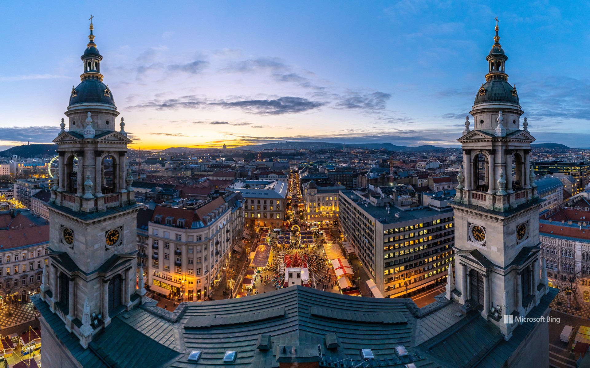 这座新古典主义风格的大教堂是为了纪念匈牙利第一位君主斯蒂芬一世(又称圣斯蒂芬国王)。经过数十年的建设,该教堂于1906年竣工,教堂顶部是一个高耸的圆顶。游客可以参观教堂,欣赏错综复杂的彩色玻璃,或瞻仰据说是国王本人木乃伊化的右手遗骸。穹顶上有一个观景台,游客可以在此俯瞰城市的全景,如今天的图片所示。