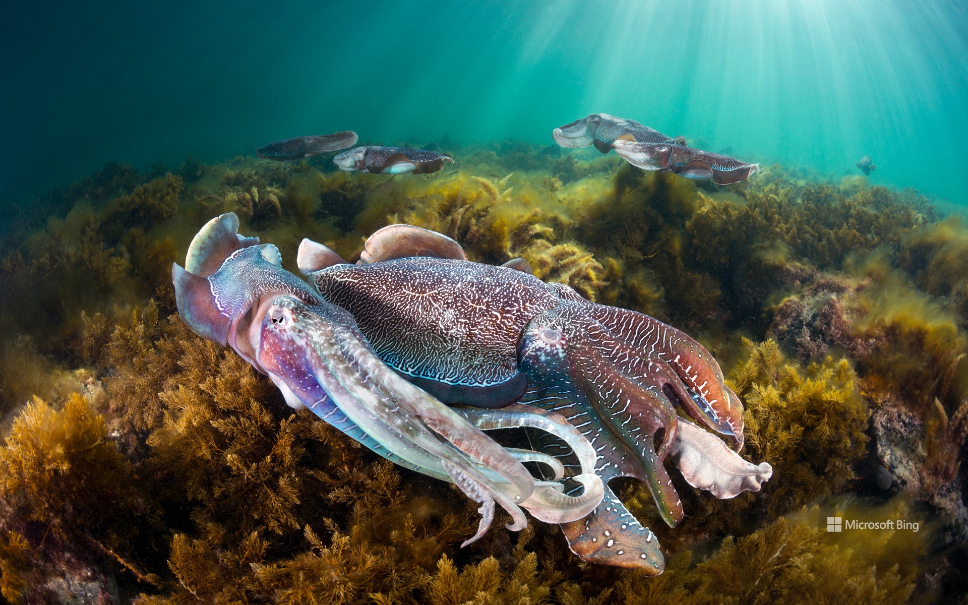 伞膜乌贼以惊人的伪装能力闻名,它能够在瞬间改变外观,与周围环境融为一体。这种乌贼生活在澳大利亚温带和亚热带水域,从昆士兰州的布里斯班到西澳大利亚州的鲨鱼湾,一直延伸至塔斯马尼亚南部海域。今日图片拍摄于南澳大利亚怀阿拉,这里的伞膜乌贼种群存在显著的性别失衡,雄性数量远多于雌性,因此繁殖权的竞争异常激烈。伞膜乌贼,也被称为澳大利亚巨型乌贼,是地球上体型最大的乌贼之一。其外套膜长度可达 20 英寸,触手完全伸展时总长度可达 39 英寸。体重超过 23 磅。和所有乌贼一样,伞膜乌贼拥有八条腕足、两条触手、三颗心脏和蓝色的血液。不过,它最引人注目的特征是其皮肤中的色素胞,能够迅速改变颜色和图案,以达到伪装的目的。尽管伞膜乌贼是色盲,但其眼睛配备了光感受器,能够检测线性偏振光,从而在捕食和伪装时仍能精确感知周围环境。