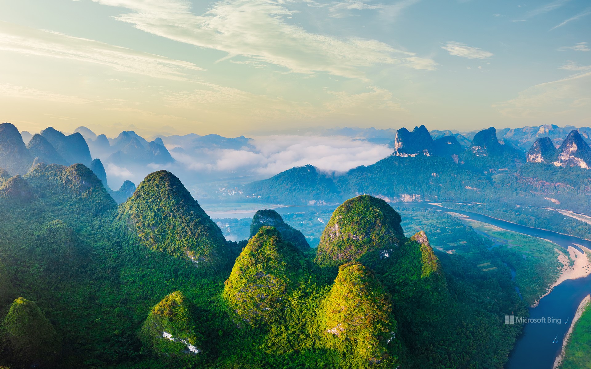 日出时分,美丽的喀斯特山脉鸟瞰图,中国桂林 (© zhaojiankang/Getty Images)