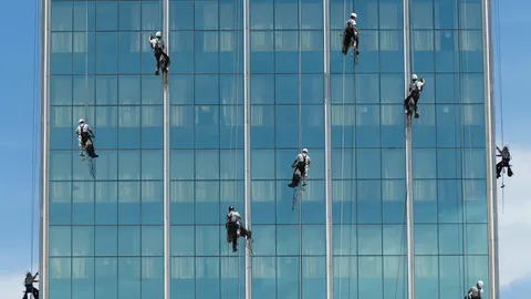 Limpadores de janelas pendurados por cordas, Rio de Janeiro (© Buena Vista Images/Getty Images)